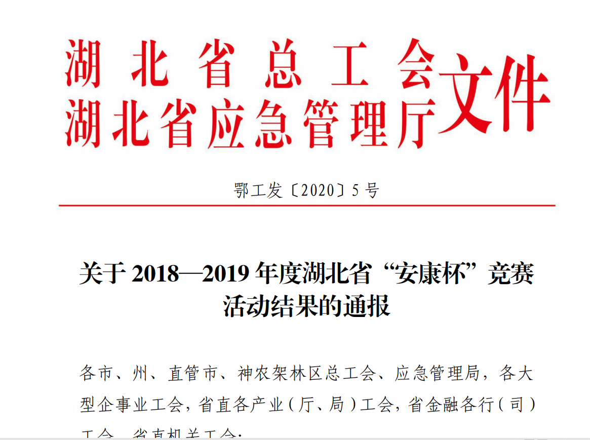 湖北省“安康杯”競賽由湖北省總工會(huì )、湖北省應急管理廳聯(lián)合主辦?!鞍部当备傎惪己藰藴室罁餍袠I(yè)的安全生產(chǎn)管理特點(diǎn)、傷亡事故和職業(yè)病控制水平等綜合因素制定,通過(guò)競賽考核參賽企業(yè)的安全生產(chǎn)管理、領(lǐng)導者安全生產(chǎn)意識、職工安全生產(chǎn)知識水平和能力、安全生產(chǎn)等各項指標。2018—2019年度共評出58個(gè)優(yōu)勝單位、30個(gè)優(yōu)秀組織單位、40名優(yōu)秀個(gè)人。