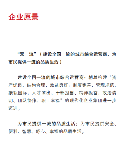 企業(yè)愿景:“雙一流”(建設全國一流的城市綜合運營(yíng)商、為市民提供一流的品質(zhì)生活)