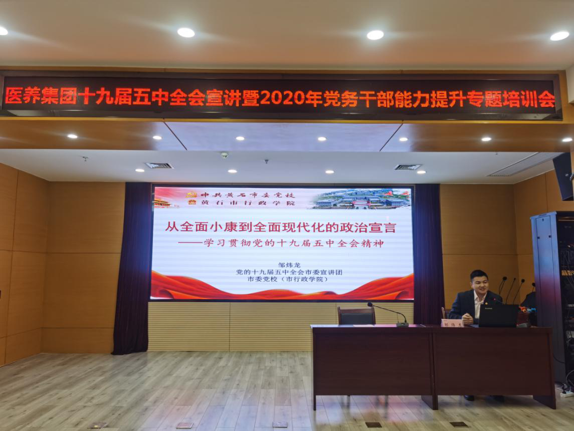 為深入學(xué)習宣傳貫徹黨的十九屆五中全會(huì )精神,11月28日,醫養集團組織召開(kāi)十九屆五中全會(huì )精神宣講暨黨務(wù)干部能力提升專(zhuān)題培訓會(huì )。醫養集團領(lǐng)導班子及直屬單位領(lǐng)導班子、機關(guān)部室負責人、直屬各單位黨政辦負責人、基層支部書(shū)記、黨務(wù)干部參加培訓。