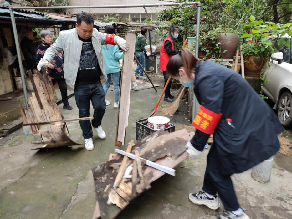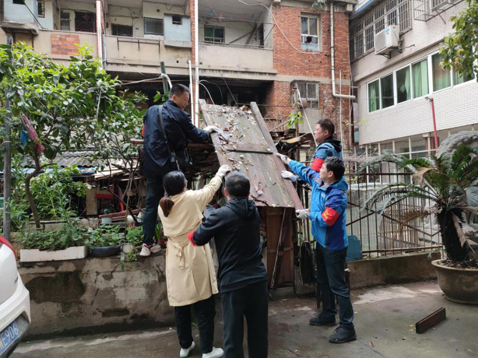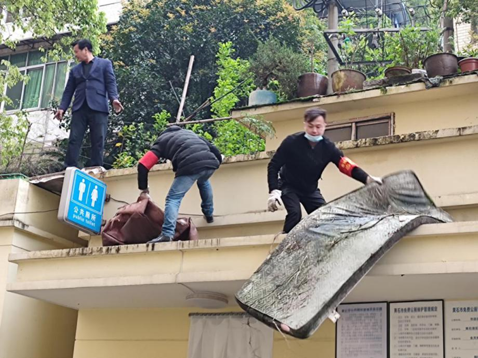 在社區工作者的引導下,大家分工協(xié)作,耐心勸導私搭亂建的居民,并對轄區內的公共場(chǎng)所亂搭亂建、垃圾雜物等進(jìn)行集中清理。志愿者們有的清理居民樓下亂搭的雨棚,有的清理公共廁所頂上的雜物、還有的志愿者在清理依山而建樓梯上的垃圾。