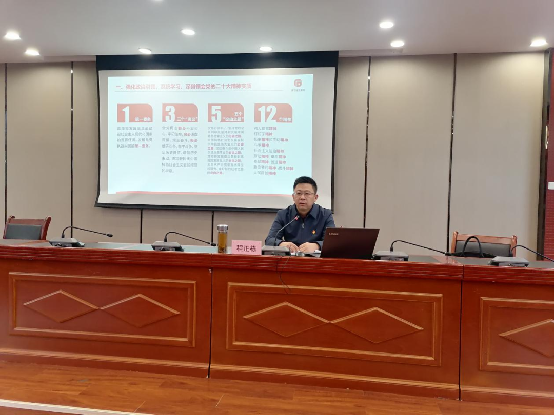 集團黨委書(shū)記、董事長(cháng)程正棟以《學(xué)習二十大精神,錨定千百十目標,奮力開(kāi)創(chuàng )“五個(gè)城發(fā)”建設新局面》為題講授專(zhuān)題黨課,從“強化政治引領(lǐng),系統學(xué)習、深刻領(lǐng)會(huì )黨的二十大精神實(shí)質(zhì);強化目標導向,持續推進(jìn)中國式現代化背景下的國企改革;強化知行合一,堅決推動(dòng)黨的二十大精神在黃石城發(fā)落地見(jiàn)效”三個(gè)方面作了深入輔導。