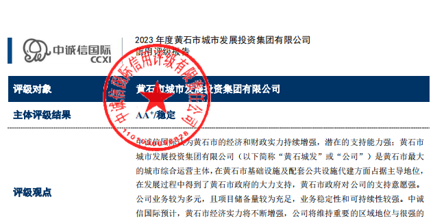 中誠信國際信用評級有限責任公司確定黃石城發(fā)集團主體長(cháng)期信用等級為AA+,評級展望為穩定。黃石城發(fā)集團是黃石地區目前唯一一家,也是湖北省內繼宜昌、襄陽(yáng)、荊州后,第四個(gè)地級市中榮獲中誠信評級公司AA+主體信用等級的國有企業(yè)。