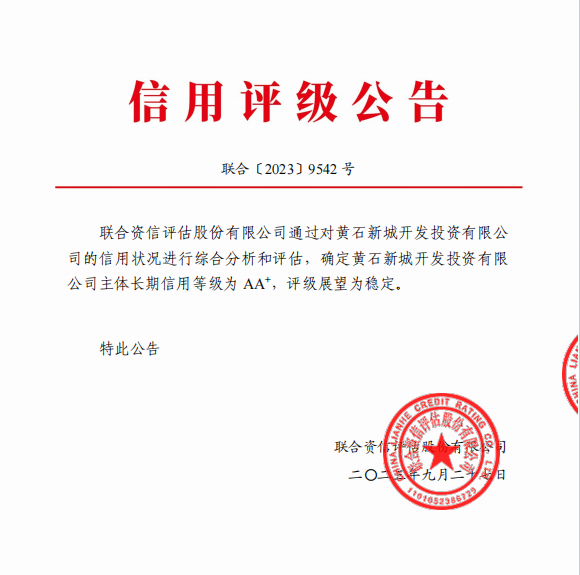 9月27日,經(jīng)國內權威評級機構聯(lián)合資信評估股份有限公司綜合評定,黃石新城開(kāi)發(fā)投資有限公司(以下簡(jiǎn)稱(chēng)“黃石新開(kāi)投”)榮獲AA+主體信用等級,評級展望為穩定,至此,黃石城發(fā)體系成為黃石市唯一一家母子公司同時(shí)擁有AA+主體信用等級的國有企業(yè),且是湖北省內第一個(gè)國有企業(yè)二級子公司直接獲評AA+主體評級的地級市。