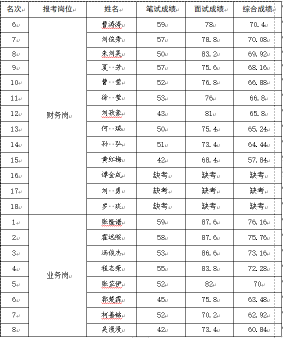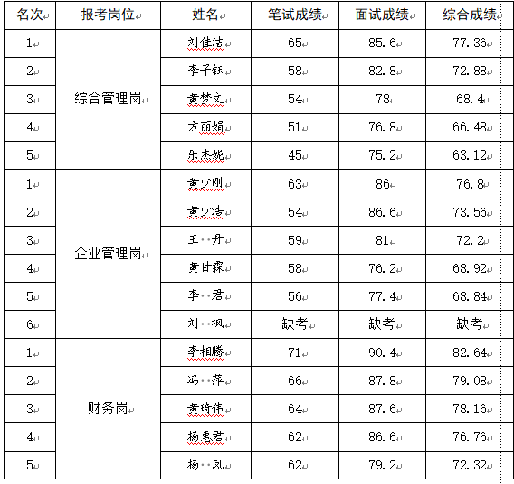 根據《黃石城發(fā)集團總部公開(kāi)遴選工作人員公告》,按筆試成績(jì)占40%、面試成績(jì)占60%的比例計算綜合成績(jì)?,F將市城發(fā)集團總部遴選工作人員筆試、面試及綜合成績(jì)公告如下: