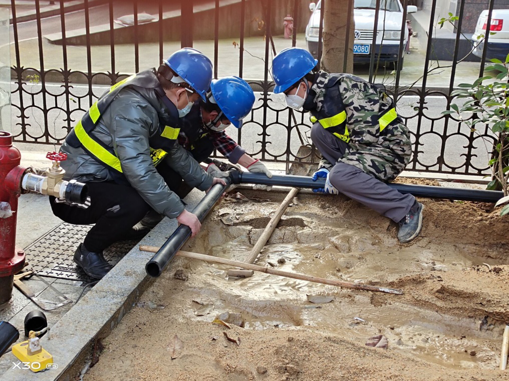 為保障黃石市新型冠狀病毒肺炎疫情防控指揮部將新建臨時(shí)食堂正常用水,2月3日,接到通知的當天市自來(lái)水有限公司迅速安排客服中心、設計公司以及建設工程公司相關(guān)負責人趕赴現場(chǎng),特事特辦,三個(gè)部門(mén)現場(chǎng)進(jìn)行勘測設計、制定方案并迅速組織材料施工,僅5小時(shí)便完成外部敷設供水管道96米、安裝閥門(mén)2臺,具備了通水條件。不忘初心,特殊時(shí)期依舊心系民生。2月1日,黃石公園一名用戶(hù)反映無(wú)水,公司立即安排經(jīng)營(yíng)銷(xiāo)售公司與該物業(yè)公司聯(lián)系。經(jīng)了解,是該物業(yè)公司管理的一棟樓房高壓區無(wú)水。物業(yè)公司人員趕到現場(chǎng)查看后,分析可能是二次加壓泵壞了或管道破損漏水,希望得到專(zhuān)業(yè)的幫助。市自來(lái)水有限公司秉著(zhù)盡快解決用戶(hù)用水問(wèn)題的宗旨,安排管網(wǎng)維護公司檢測中心協(xié)助找到了漏水點(diǎn)并于當天下午及時(shí)恢復了供水。