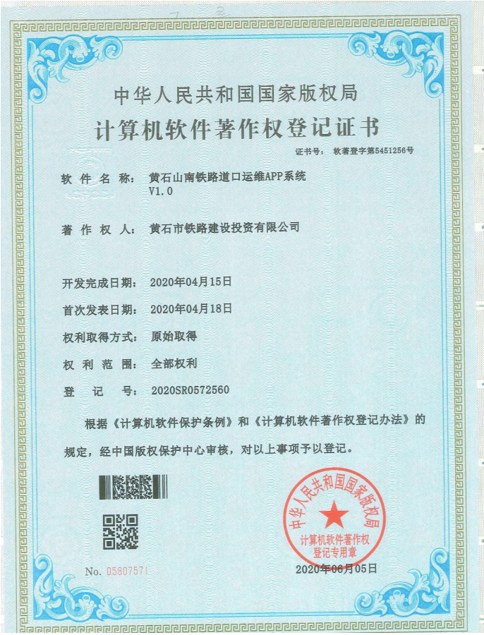 黃石山南鐵路道口無(wú)人值守技術(shù)共申請國家級8項專(zhuān)利技術(shù) ,其中《黃石山南鐵路道口智能化控制系統》、《黃石山南鐵路道口列車(chē)車(chē)載聯(lián)動(dòng)顯示系統》、《黃石山南鐵路道口調度中心綜合監管系統》、《黃石山南鐵路道口運維APP系統》4項成果已取得計算機軟件著(zhù)作版權登記。