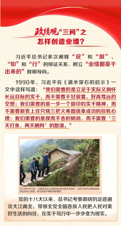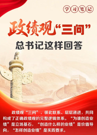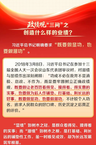2022年3月1日,在中央黨校(國(guó)家行政學(xué)院)中青年干部培訓(xùn)班開(kāi)班式上,面對(duì)年輕干部,習(xí)近平總書記提出政績(jī)觀“三問(wèn)”——“創(chuàng)造業(yè)績(jī),必須解決好為誰(shuí)創(chuàng)造業(yè)績(jī)、創(chuàng)造什么樣的業(yè)績(jī)、怎樣創(chuàng)造業(yè)績(jī)的問(wèn)題,也就是要解決好政績(jī)觀問(wèn)題?!?