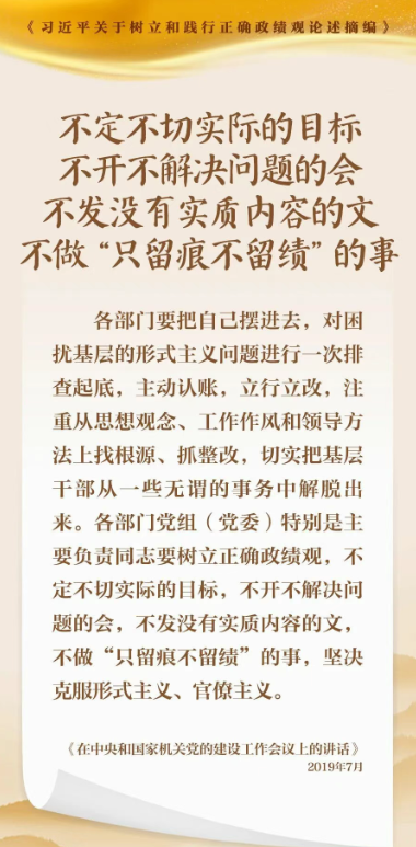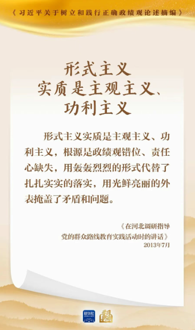 “形式主義實質是主觀主義、功利主義,根源是政績觀錯位、責任心缺失?!绷暯娇倳浉叨戎匾暭訌婞h的作風建設,針對反對形式主義官僚主義等、樹立和踐行正確政績觀作出一系列重要論述。我們選取《習近平關于樹立和踐行正確政績觀論述摘編》一書中的相關論述,一起學習領會。